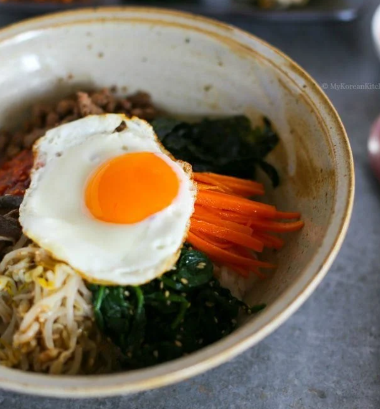 Put the rice into a bowl and add the meat, assorted vegetables, seasoned seaweed, bibimbap sauce, and the egg on top of the rice. Serve.