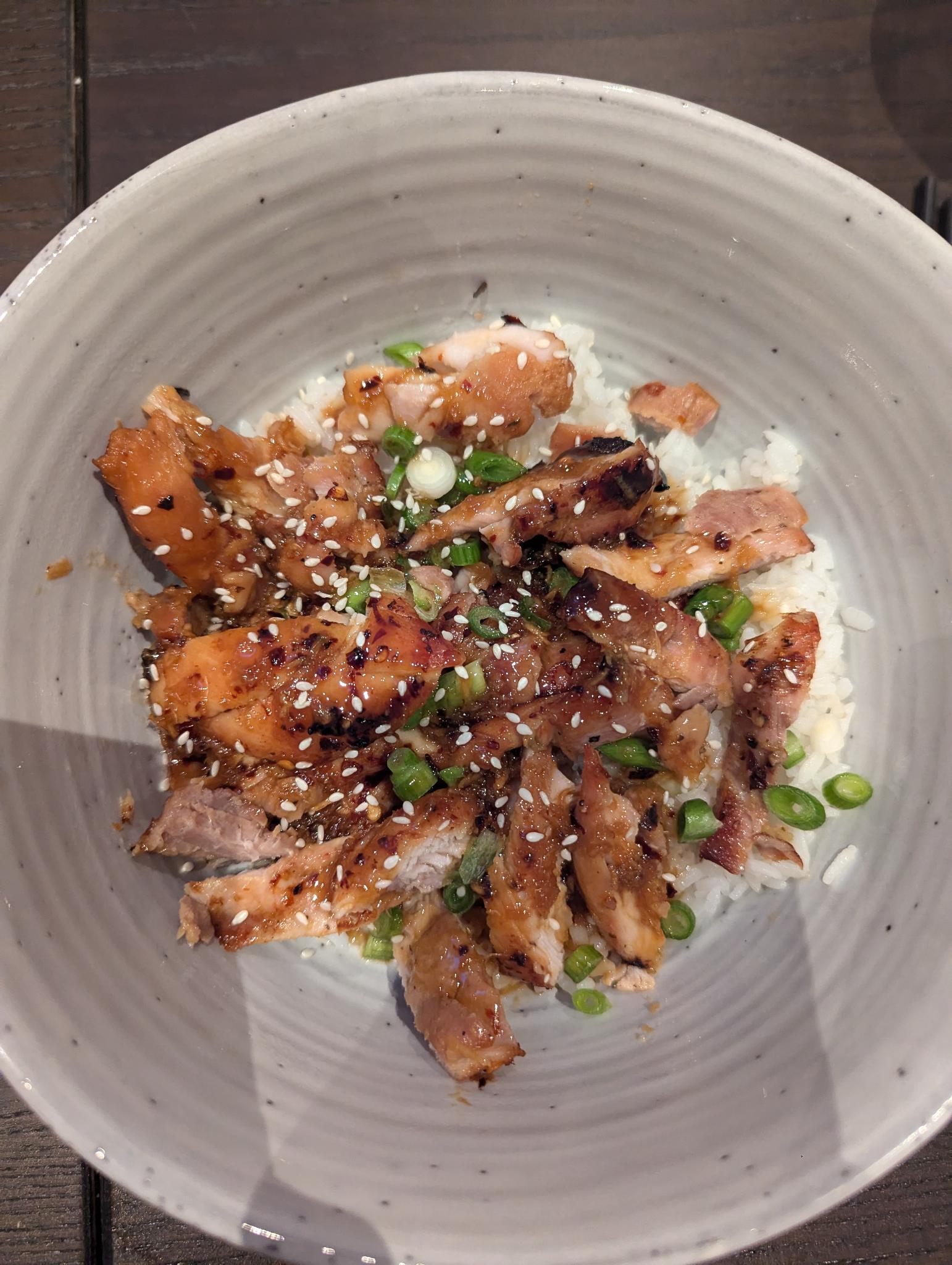 Drizzle the glaze over the chicken thighs and top with the sliced spring onions, sesame seeds and fresh coriander to serve.